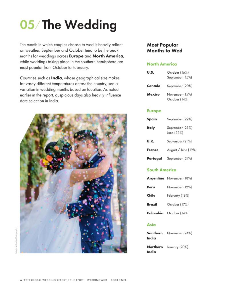 WeddingWire, The Knot ve Bodas.net`in 2019 yılı için 14 ülkeden 20,000 çift ile hazırladığı küresel evlilik raporu, dünya genelinde evlilik ve düğün süreçleri hakkında kapsamlı bir fikir elde etmemizi sağlıyor. Rapora göre, sonbahar ayları özellikle Kuzey Amerika ve Avrupa`da düğün yapmak için en popüler dönem olarak göze çarpıyor. Büyük gün öncesi planlamaların süreleri karşılaştırıldığında, 7 ay ile hazırlıkların en kısa sürede bitirildiği ülke Kolombiya. Düğün öncesi planlamaları en ağırdan alan çiftler ise Büyük Britanya`da yer alıyor. Britanyalı partnerler, ortalama 15 aylık bir hazırlık evresi geçiriyorlar.