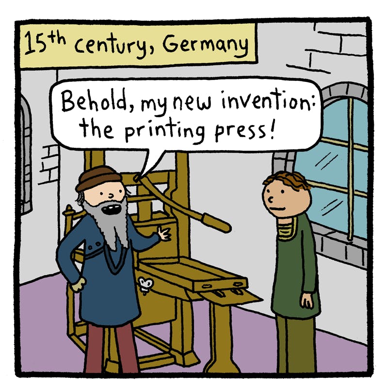 Orta Çağ`ın sonlarında gelişen ve değişen teknolojinin ardından yaygın olarak kullanılmaya başlanan gözlükler ve saatler ile birlikte bir diğer önemli icat, parşömenden kağıda geçişi sağlayan baskı teknikleriydi. Değerli çiftlik hayvanlarının derilerinden elde edilen parşömen, oldukça pahalı bir malzemeydi: Bir İncil`i yazabilmek için 2 veya 3 koyunu feda etmek gerekiyordu. Değirmenlerde hamur haline getirilmiş bezlerden yapılan kağıt ise maliyetlerde dramatik değişikliklere sebep oldu. Dönemin kayıtlarından alınan bilgilere göre kağıt, parşömenin altıda biri fiyatına satılıyordu.
